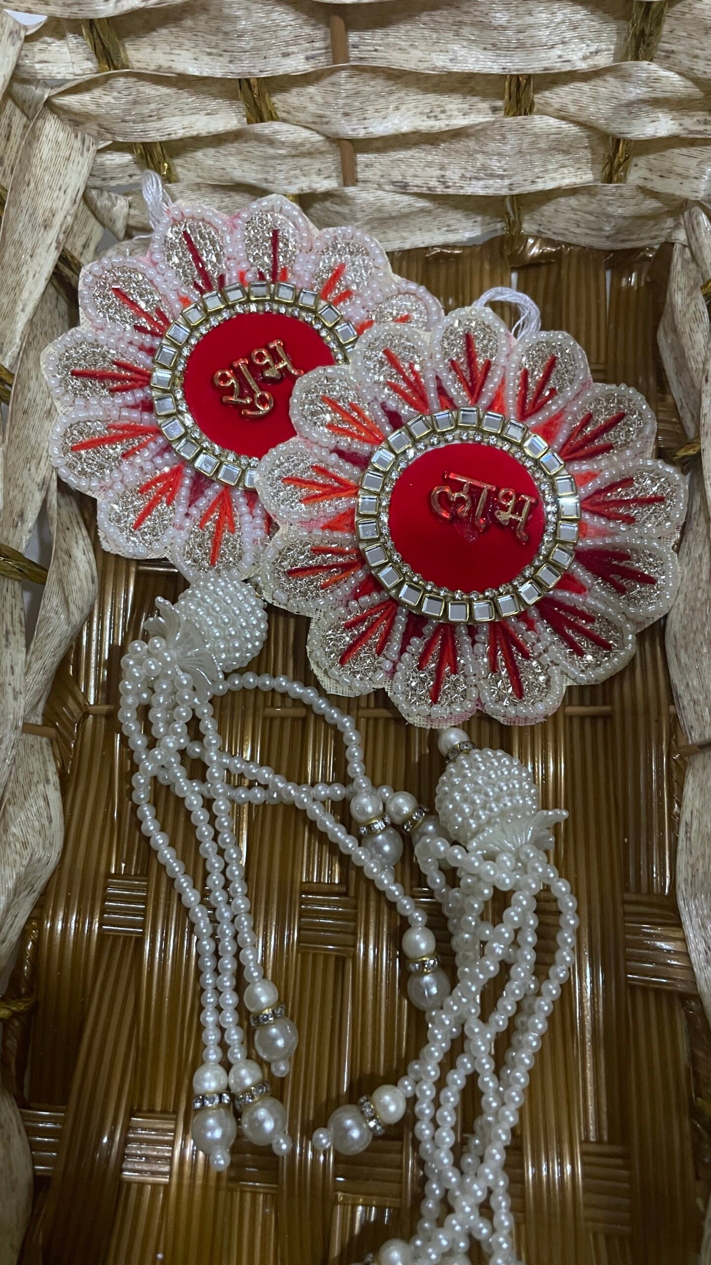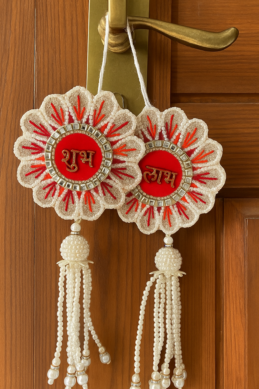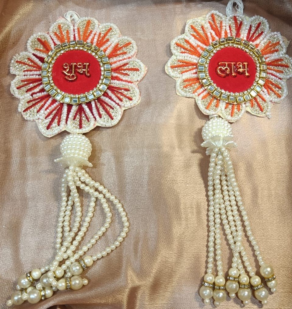 Elegant floral-shaped “Shubh” and “Labh” hangings handcrafted with pearls, beads, sequins, and mirror work on a vibrant red base. Finished with delicate pearl tassels, ideal for home entrance or festive decor.