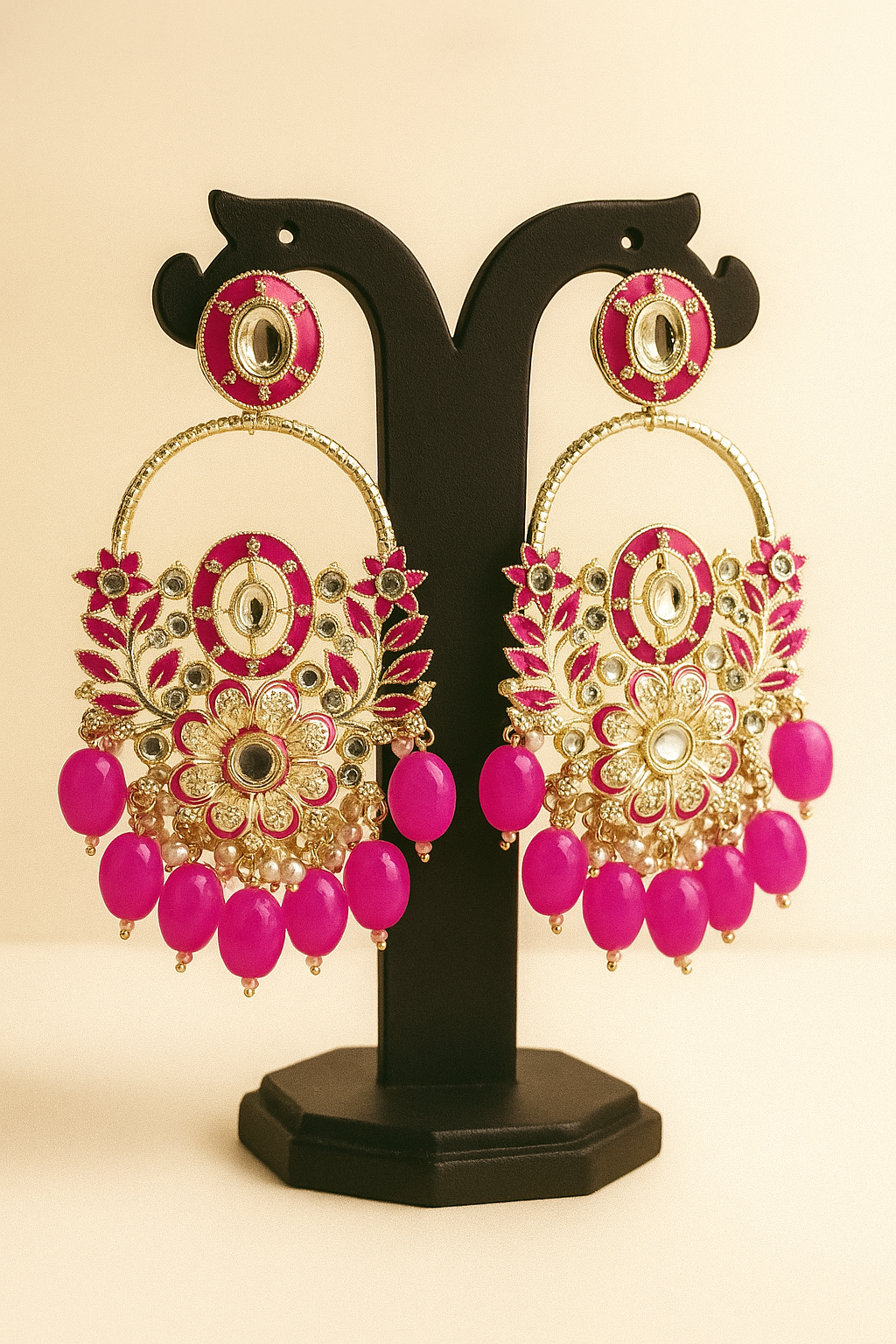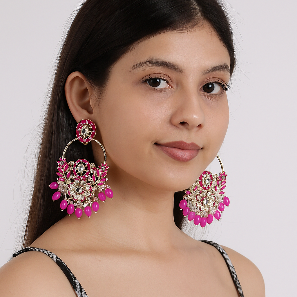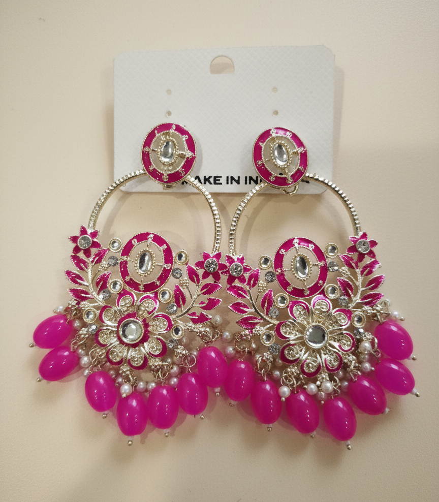 Pink and golden traditional jhumka earrings designed with intricate floral pattern, embellished with sparkling stones and dangling pink beads- perfect for festive and ethinic wear.