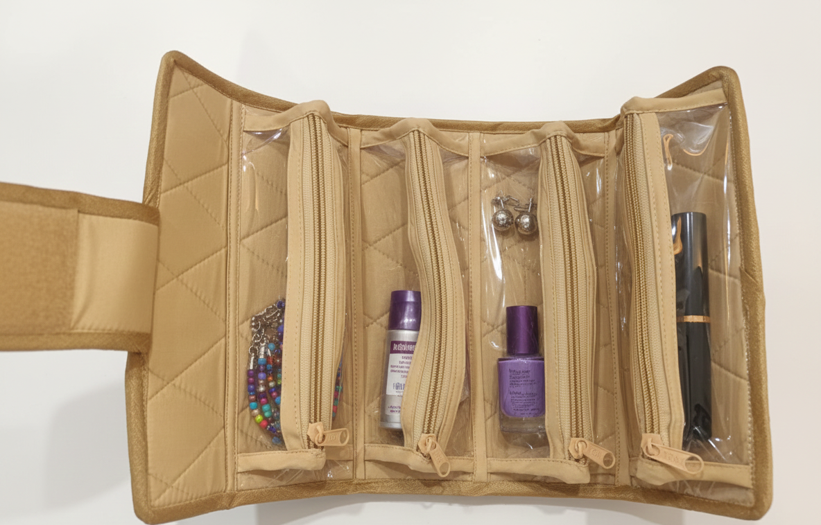 Stylish foldable pouch organizer with multiple transparent zip pockets for neatly storing cosmetics, toiletries, cables, medicines, and daily essentials.